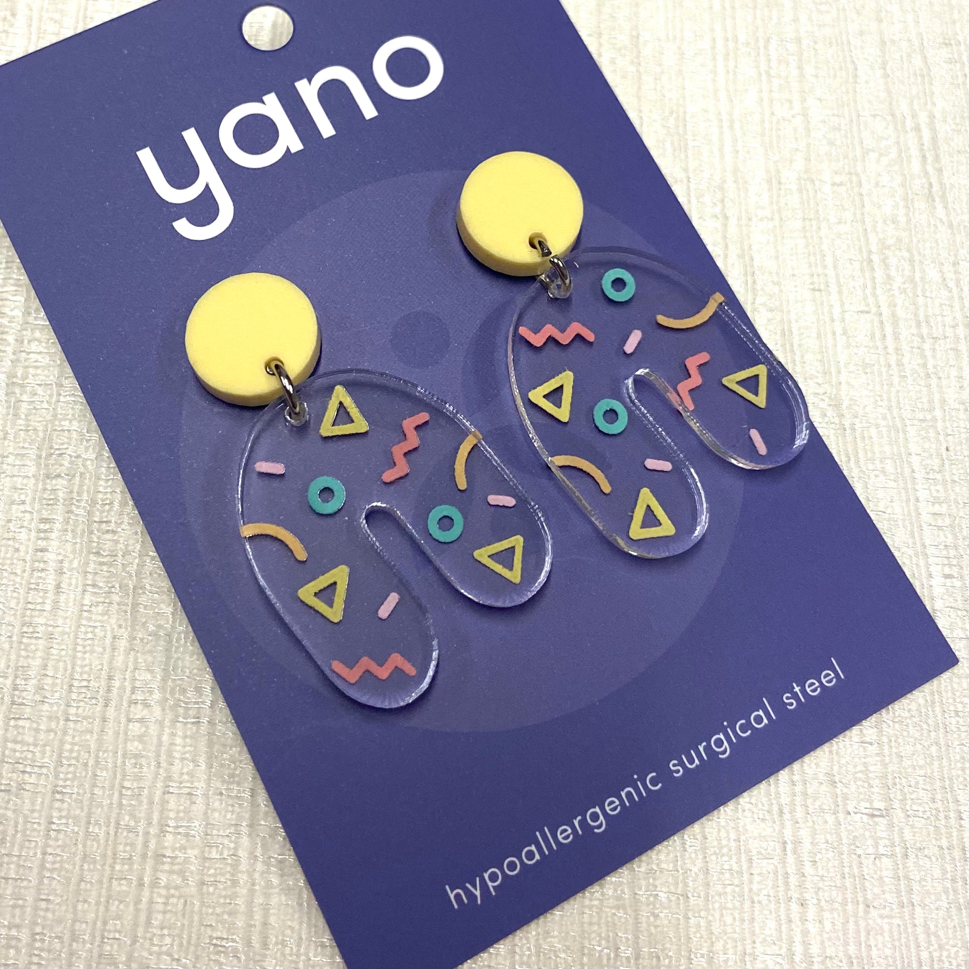 Abstract shaped dangle earrings with coloured confetti. Available in pastel mint or pastel pink upper round piece. Backed with a hypoallergenic surgical steel post – perfect for sensitive ears.
