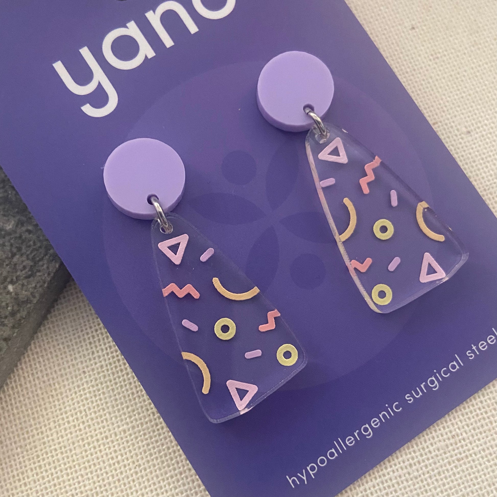 Abstract shaped dangle earrings with coloured confetti. Available in pastel mint or pastel pink upper round piece. Backed with a hypoallergenic surgical steel post – perfect for sensitive ears.