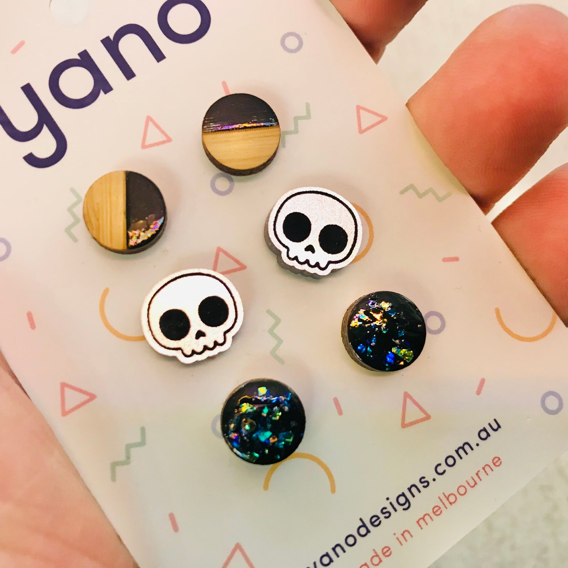 A perfect gift for any age, these sweet triple packs of earrings include a selection of hand painted bamboo, mirrored acrylic, matt colour acrylic or etched acrylic. All studs have surgical steel posts and backings.