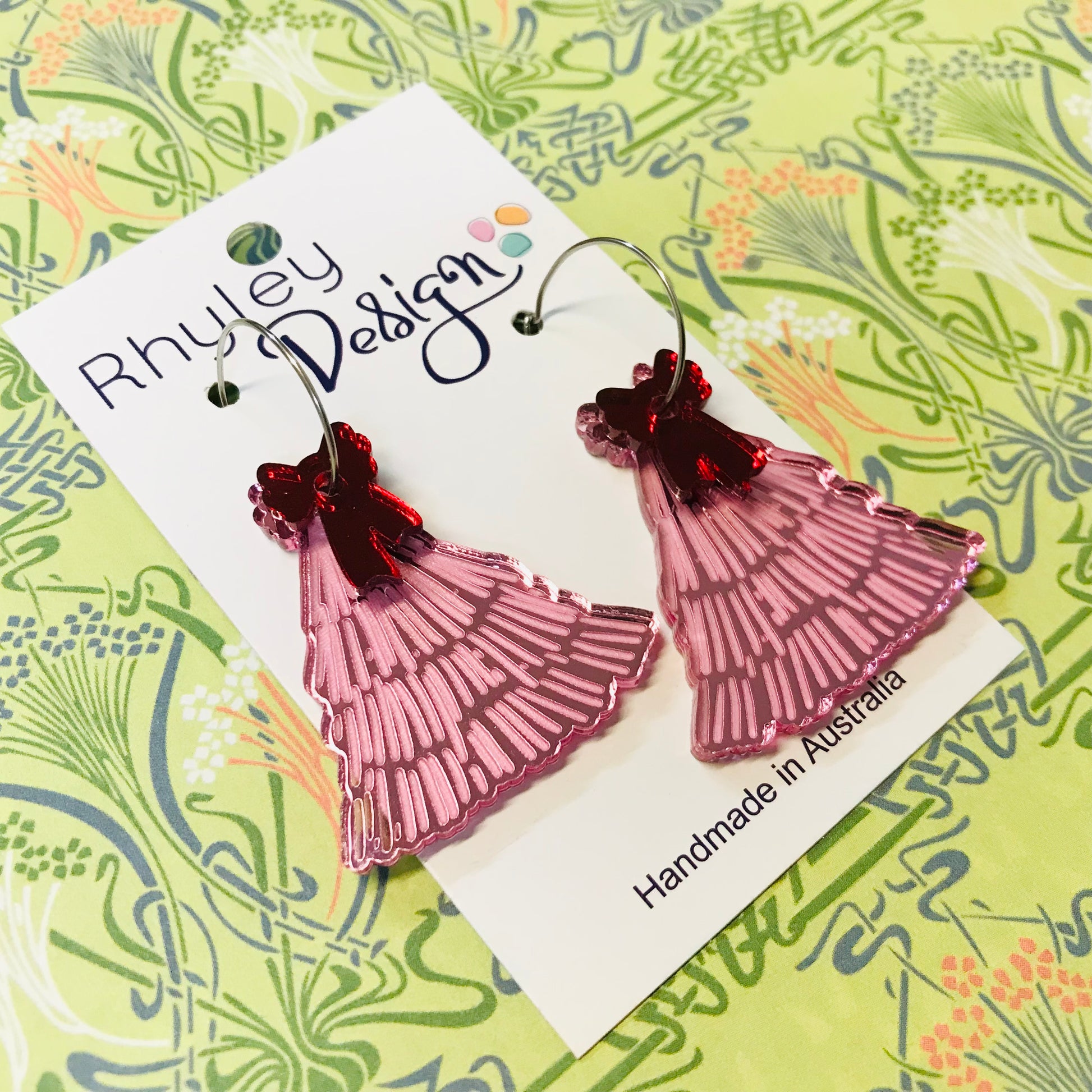 Laser-cut from mirrored acrylic and finished with stainless steel hoops.