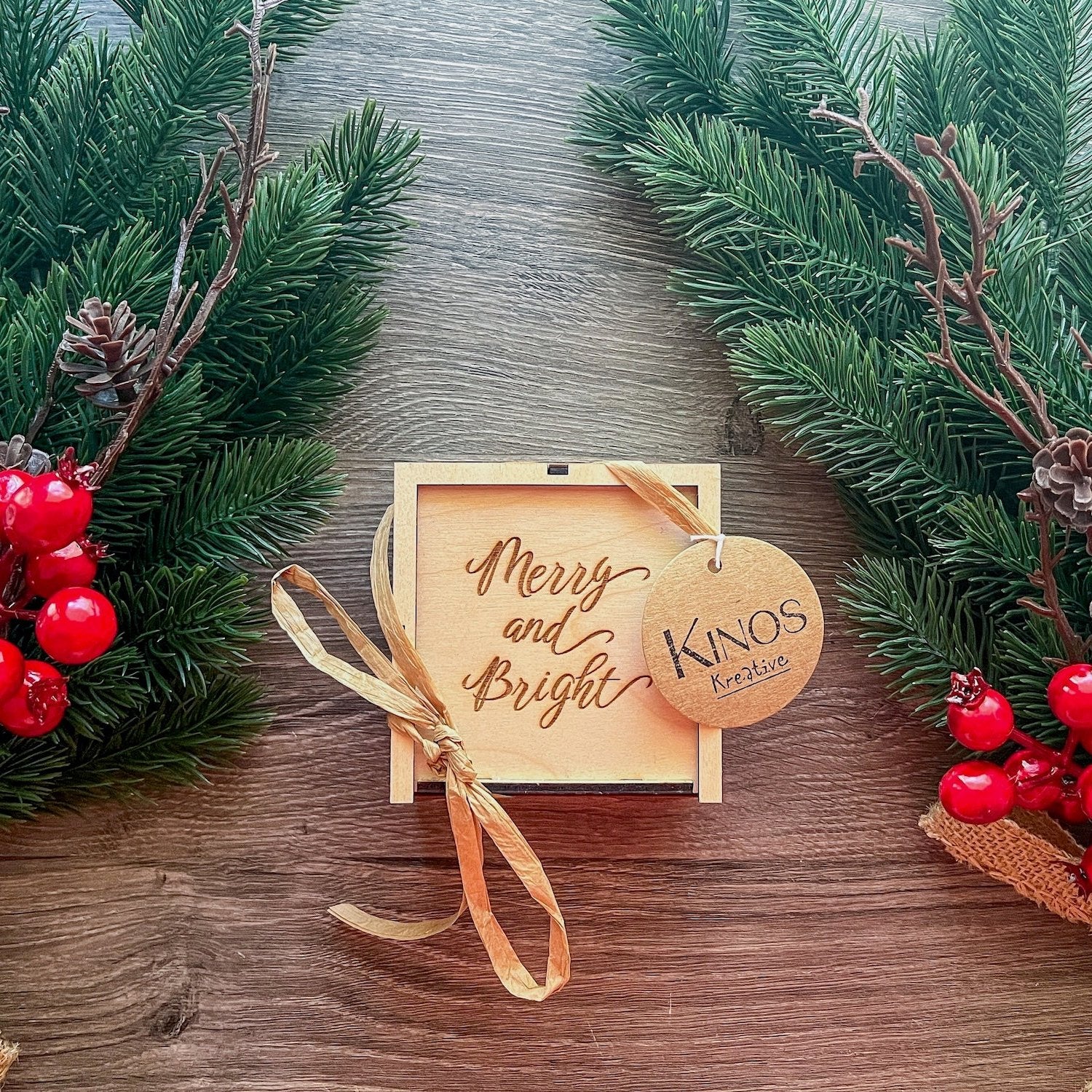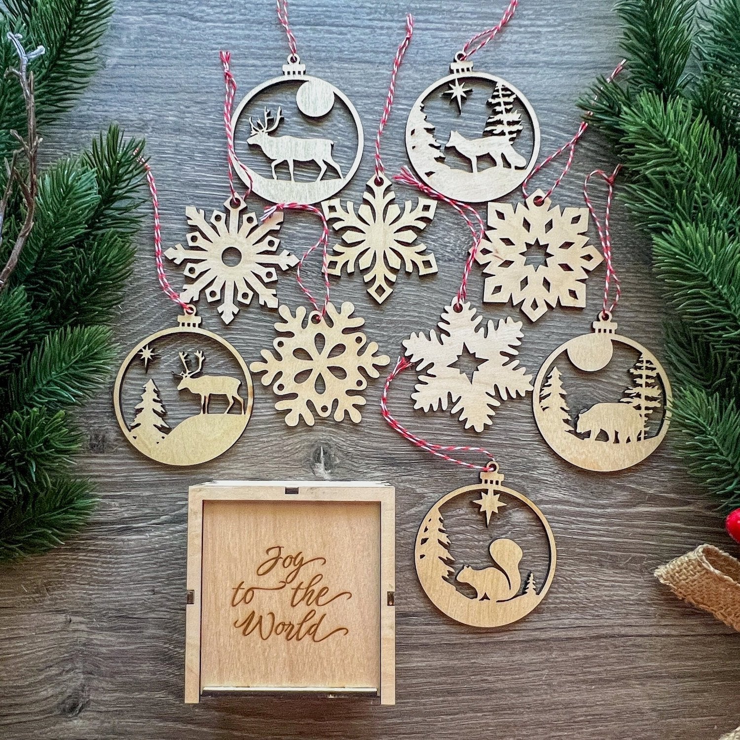 Each box contains 10 different ornaments: 5 snowflakes and 5 baubles with a red/white cotton string attached. Various Christmas wishes are engraved on the lid, with plenty to choose from! The wooden box has been designed in-house and is perfect for gifting and storing the decorations. The box and the decorations have been sprayed with a transparent matt varnish to protect the wood and give some depth.