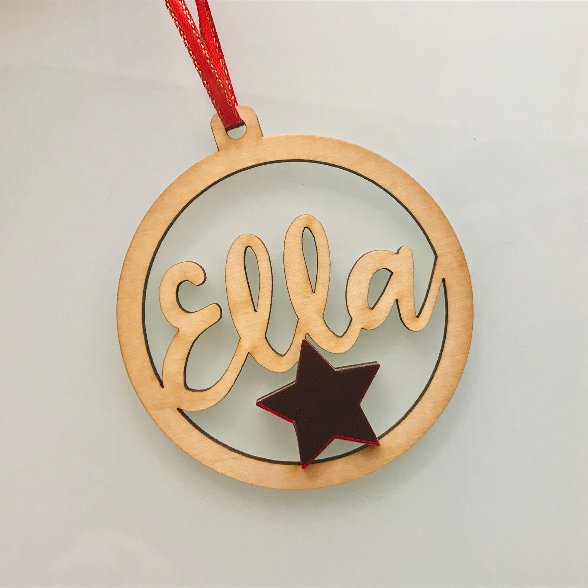 Personalise with your own name, or the name of your family, friends or pets on this Christmas bauble. Each comes adorned with an acrylic star in the colour of your choice. These baubles also come with red ribbon, making them ready to hang.