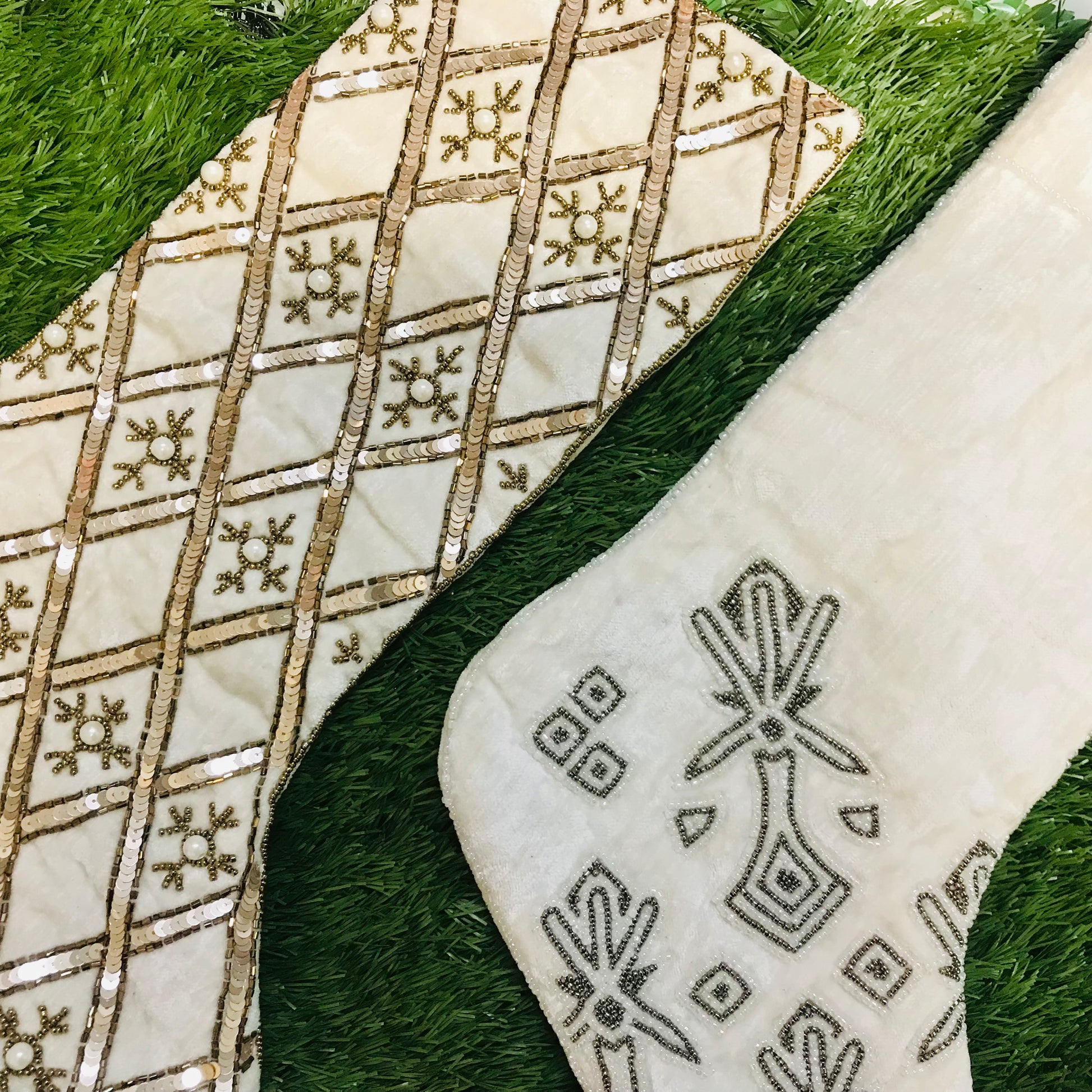 These fully lined and super soft stockings are sure to add a touch of luxe to your mantle this Christmas. Made from supersoft velvet with small edge beading detail as well as the bigger glimmer patterns on the front. Each stocking comes with a bag of extra beads for repairs (or additions)