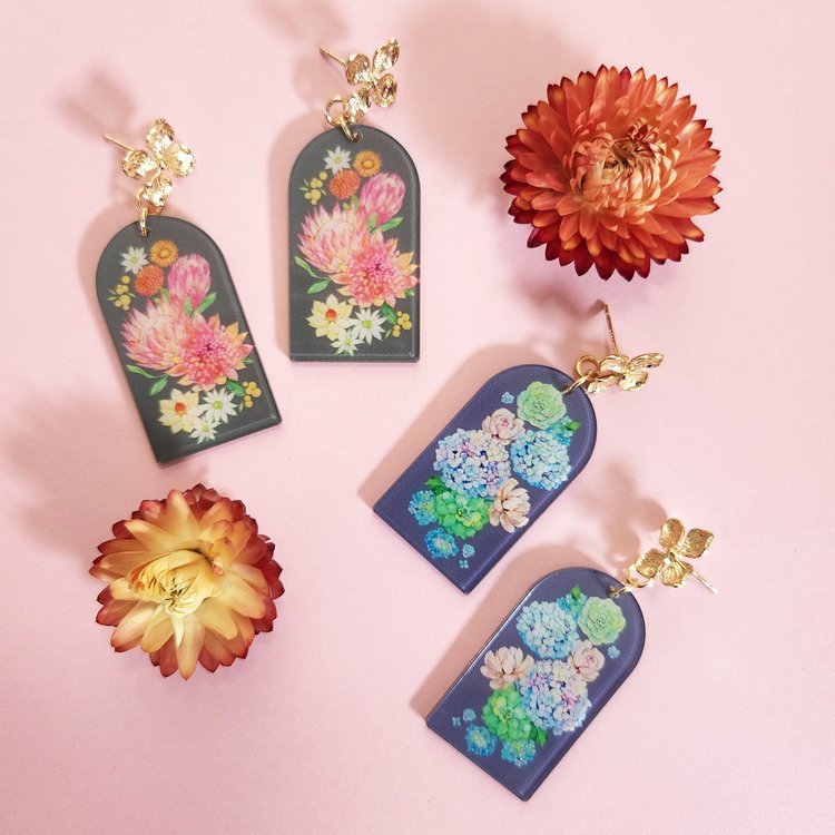 All earrings are printed on rainbow Iridescent Acrylic, 25mm X 50mm, 3mm thick.
