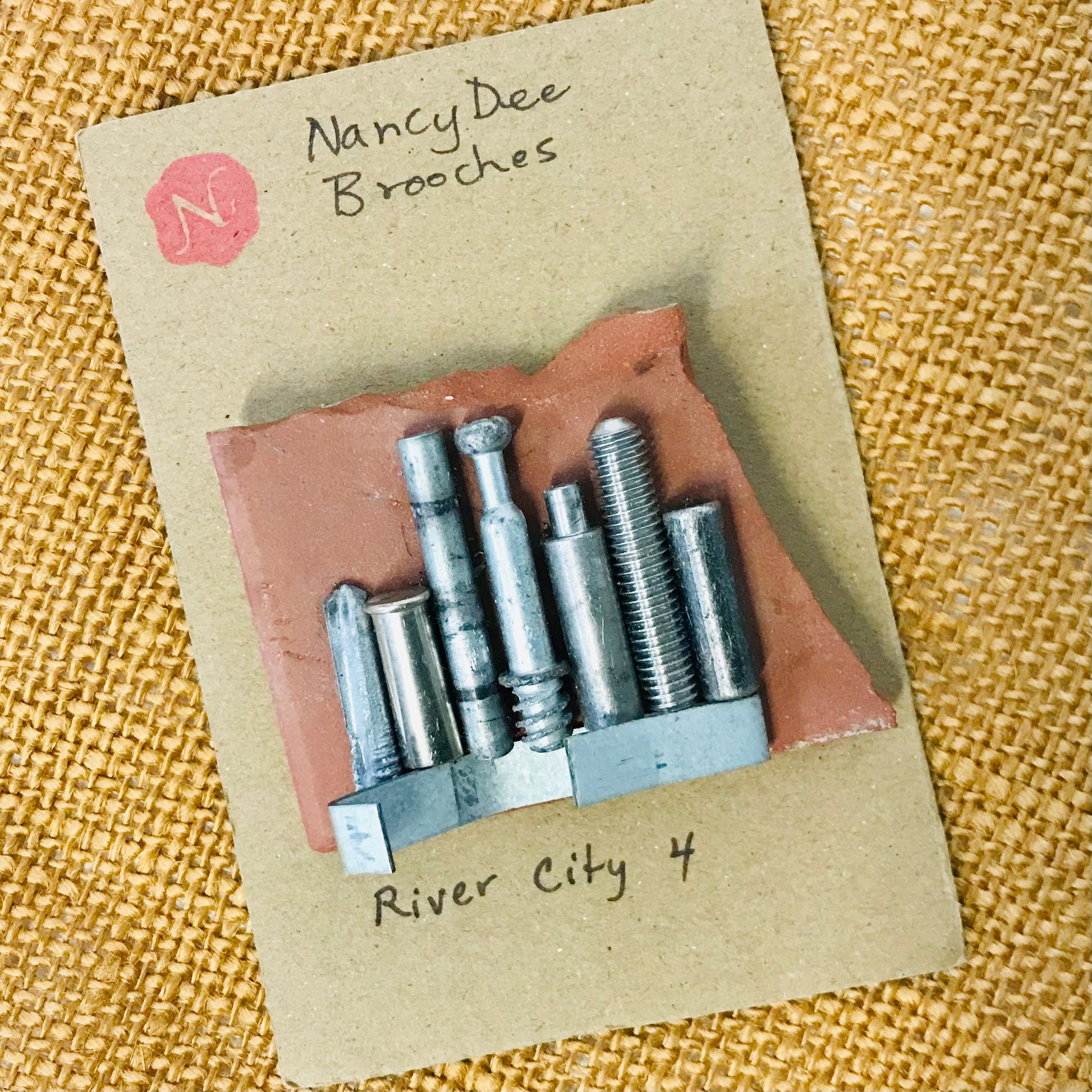Artist NancyDee has created this quirky one-of-a-kind handmade brooch using a mixture of found metal, wood, tile and plastic rubbish. These materials have been gathered from the streets and laneways of Melbourne, as well as other cities where NancyDee has worked and travelled.