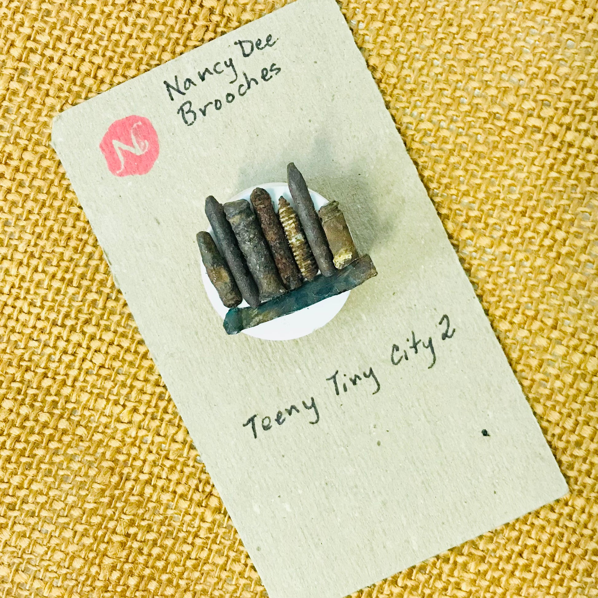 Artist NancyDee has created this quirky one-of-a-kind handmade brooch using a mixture of found metal, wood, tile and plastic rubbish. These materials have been gathered from the streets and laneways of Melbourne, as well as other cities where NancyDee has worked and travelled.