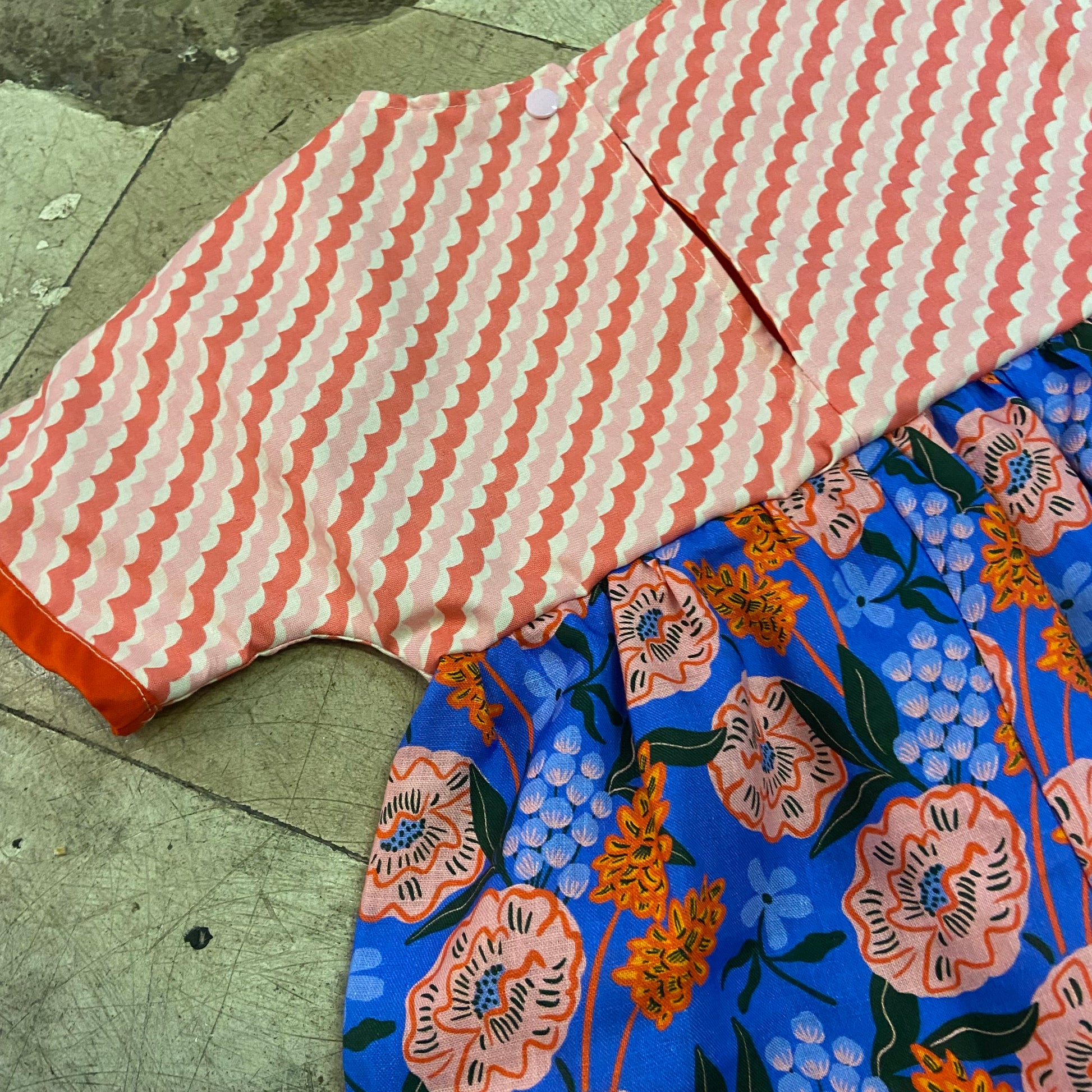 This one-of-a-kind handmade dress features capped sleeves, a lined bodice, and a gathered skirt with essential pockets. The fully lined bodice ensures comfort for warm days while also allowing easy layering when it’s chilly. It fastens partway down the back with a snap closure.