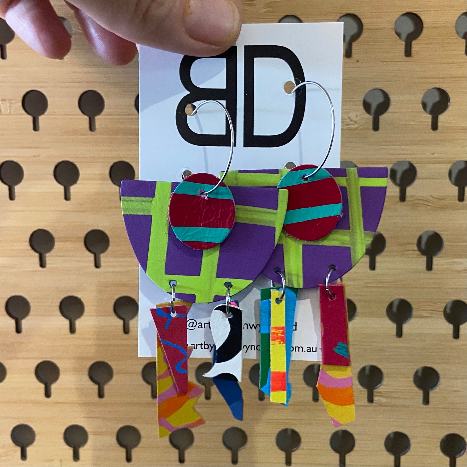 Transform your everyday look with these exquisitely handcrafted First Nations leather dangle earrings. Each pair is thoughtfully hand-painted with contemporary Indigenous designs by Palawan artist Bronwyn David and artfully cut into assorted shapes, suspended from premium stainless steel hoops for lasting durability and style.