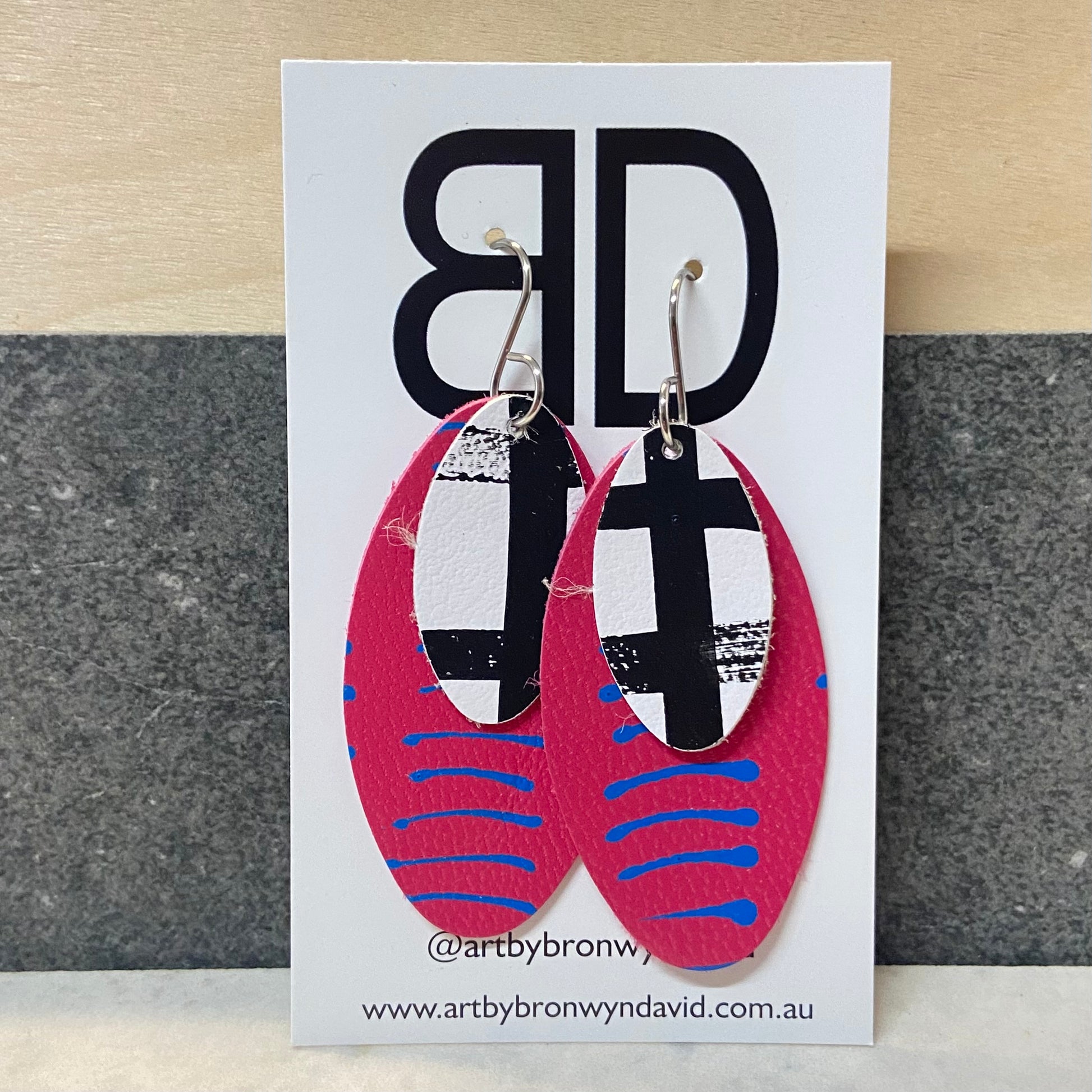 Transform your everyday look with these exquisitely handcrafted First Nations leather dangle earrings. Each pair is thoughtfully hand-painted with contemporary Indigenous designs by Palawan artist Bronwyn David and artfully cut into assorted shapes, suspended from premium stainless steel hoops for lasting durability and style.