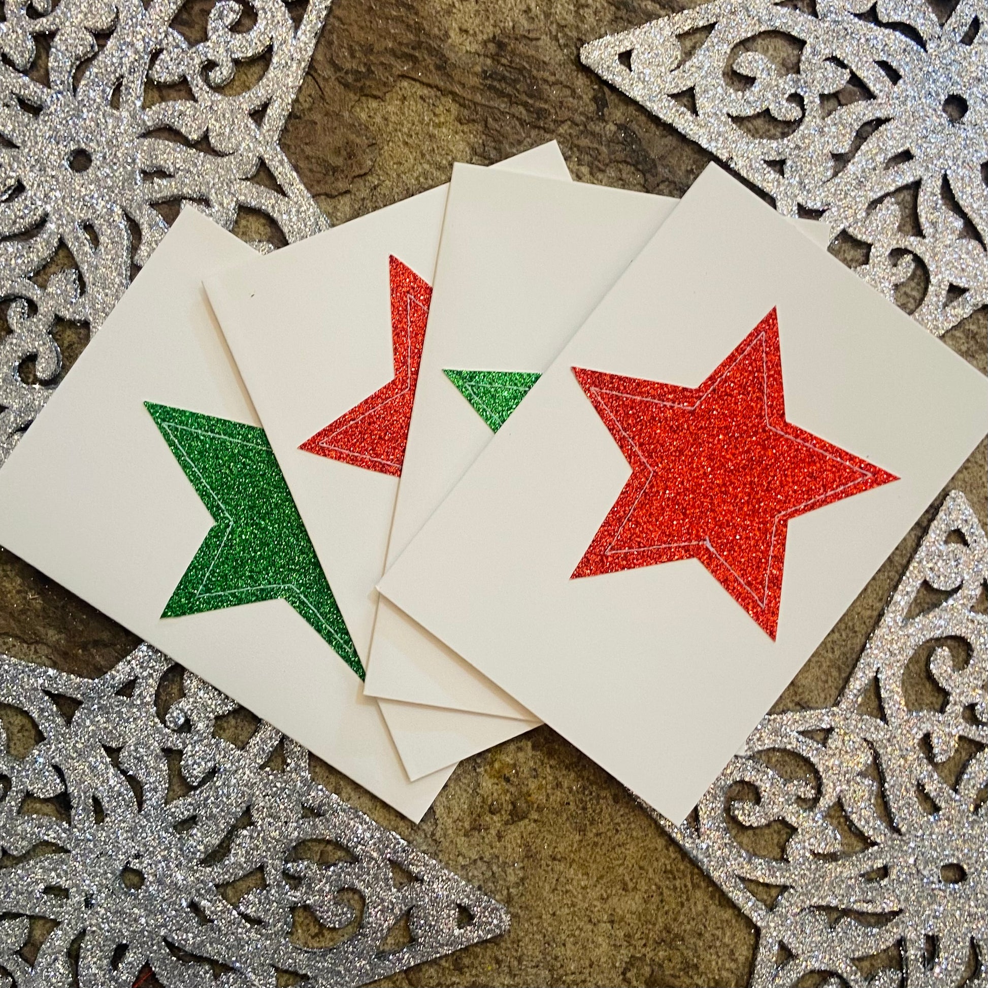 These handmade Christmas cards are made from recycled cardboard and glittered stock, these OOAK cards are finished with a glittery festive star, sewn on for added detail.