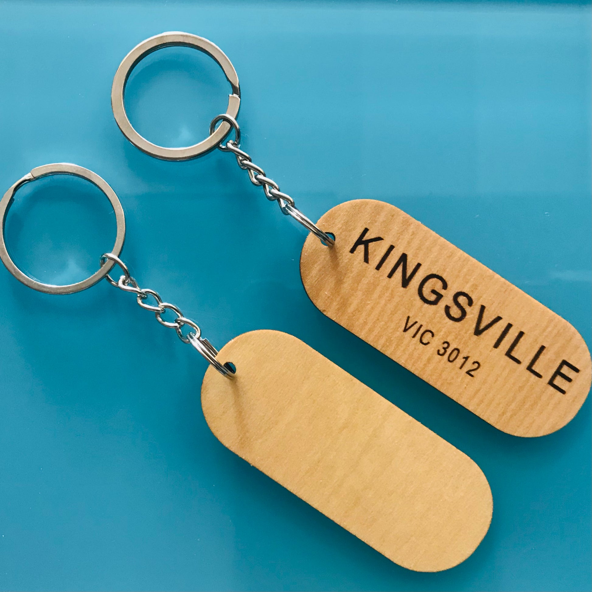 Handcrafted keyring from laser cut plywood, handmade in Melbourne's West.