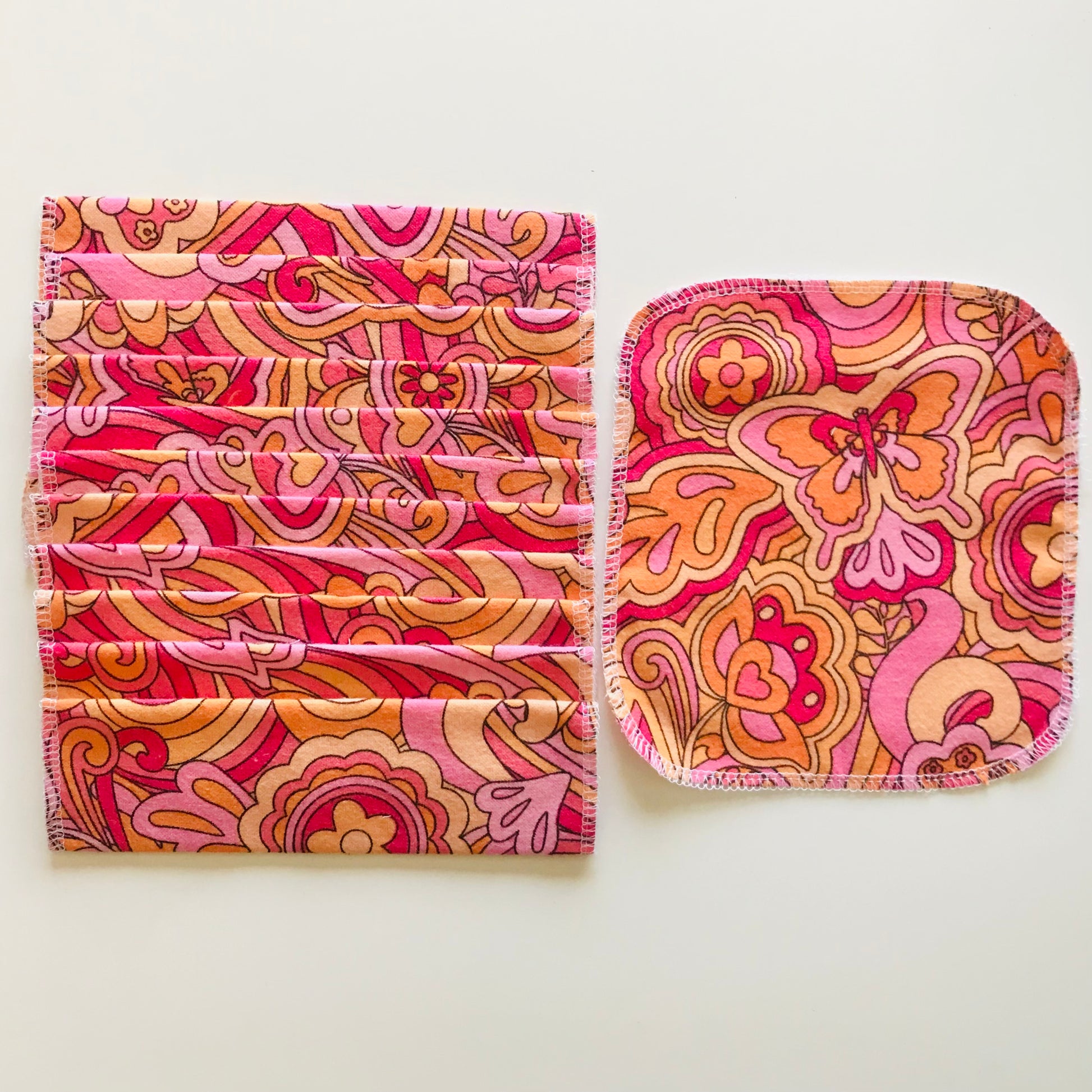 Made from 100% cotton flannel, each wipe is 1 ply flannel and approximately 18cm x 20cm. Each pack comes with 12 matching wipes and all edges have been finished to prevent fraying.