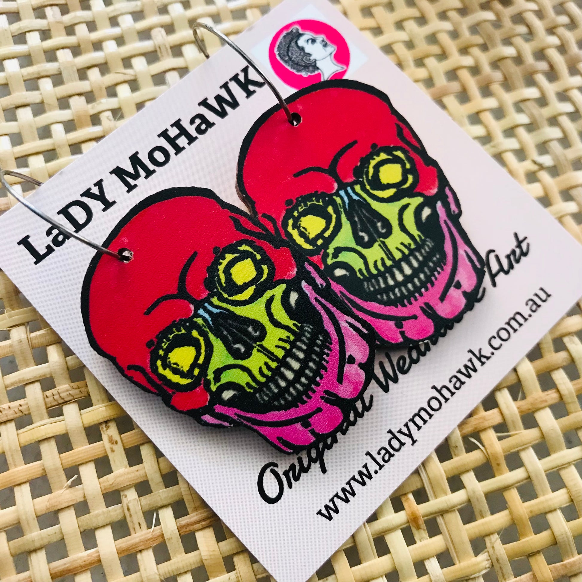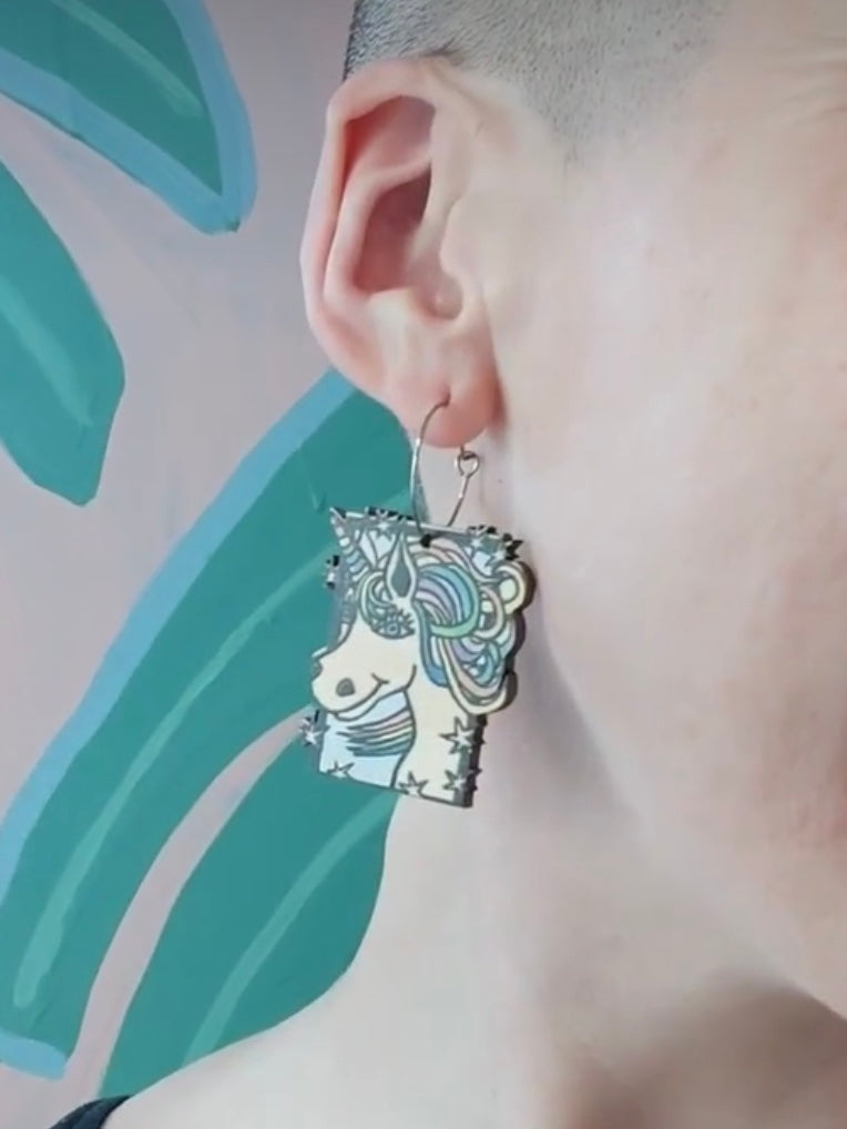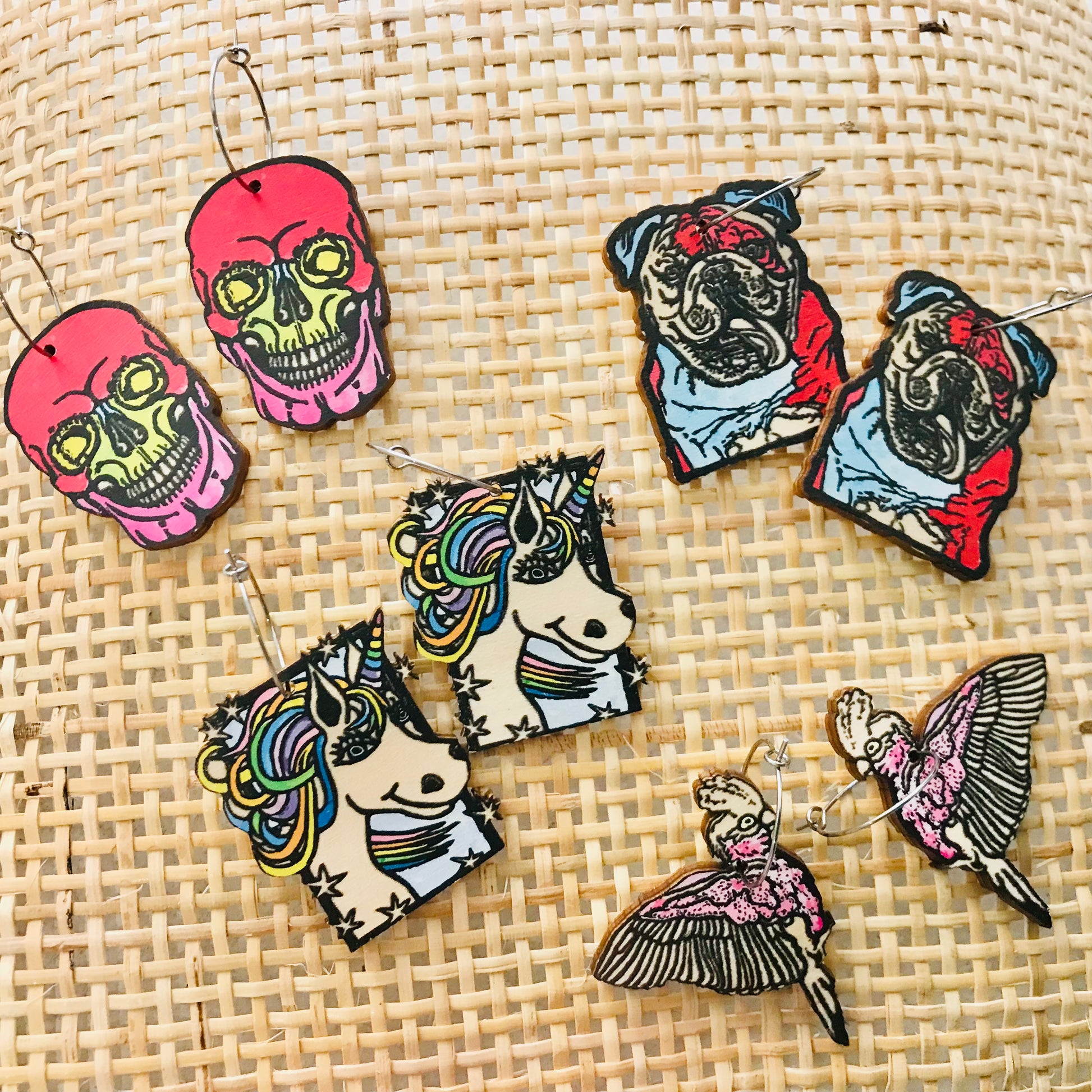 These earrings are made using an originally handmade linoprint by LaDY MoHaWk. They have been printed onto sustainably sourced hoop pine with a water resistant coating on top for better protection. They are laser cut and threaded with surgical stainless steel hoops, which is excellent for sensitive ears!