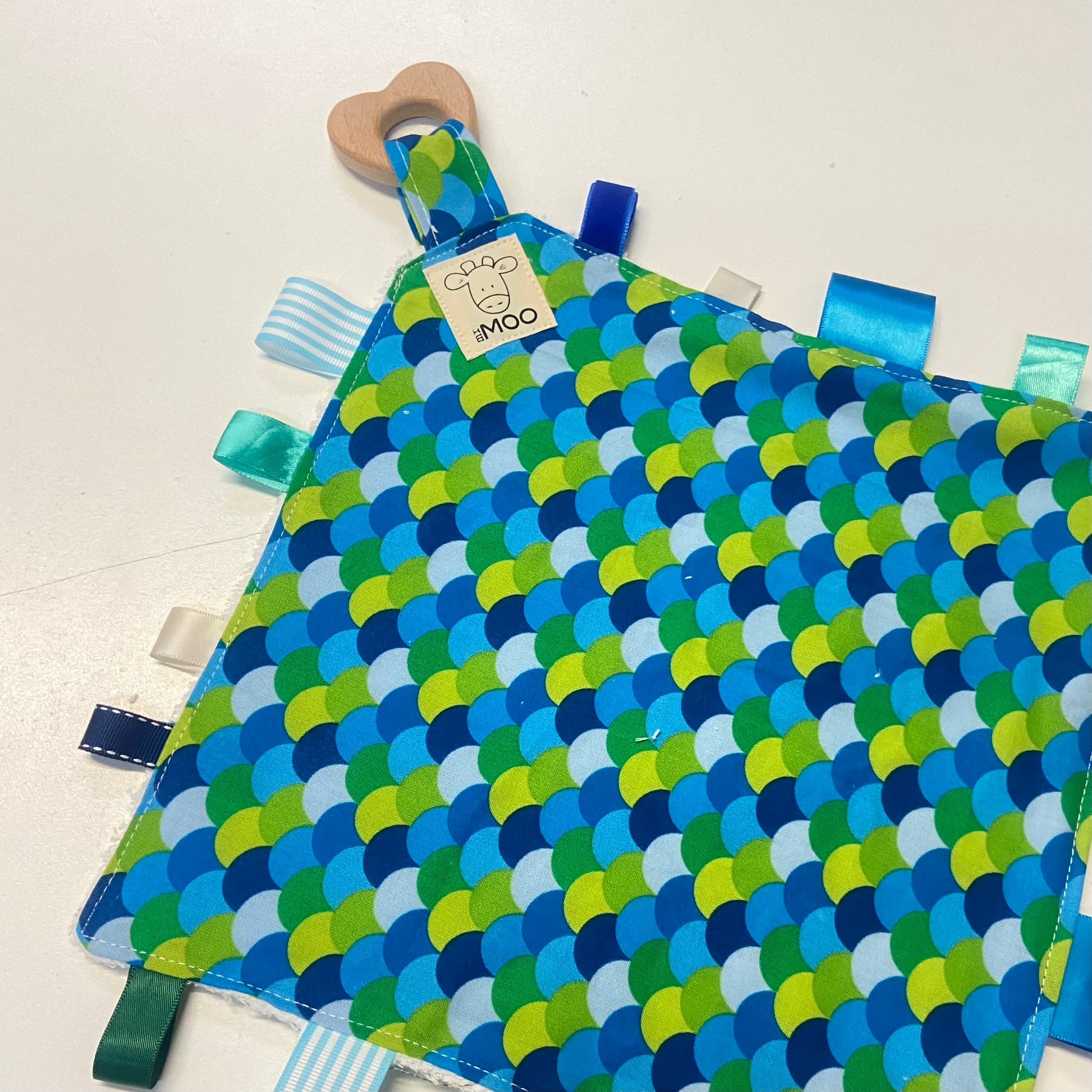 Taggies are perfect for all little ones! Babies and toddlers will love to pull, chew and play on both the soft fabric, ribbon tags and smooth wooden ring.