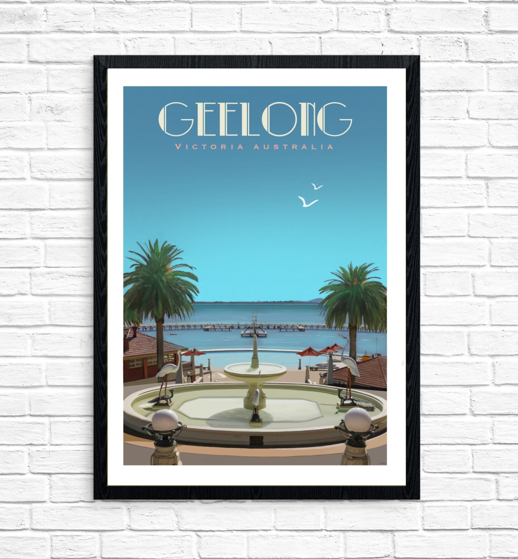 This artwork by Kerrie Gottliebsen is dedicated to Geelong’s Eastern Beach, an iconic destination located on the city’s stunning waterfront. The reserve offers a popular floating island, enclosed sea baths, children’s pool and boardwalk. They are the backdrop for wonderful memories dating back to the 1930’s when the sea baths were originally built. I love the whole deco look of the area. It’s truly beautiful.