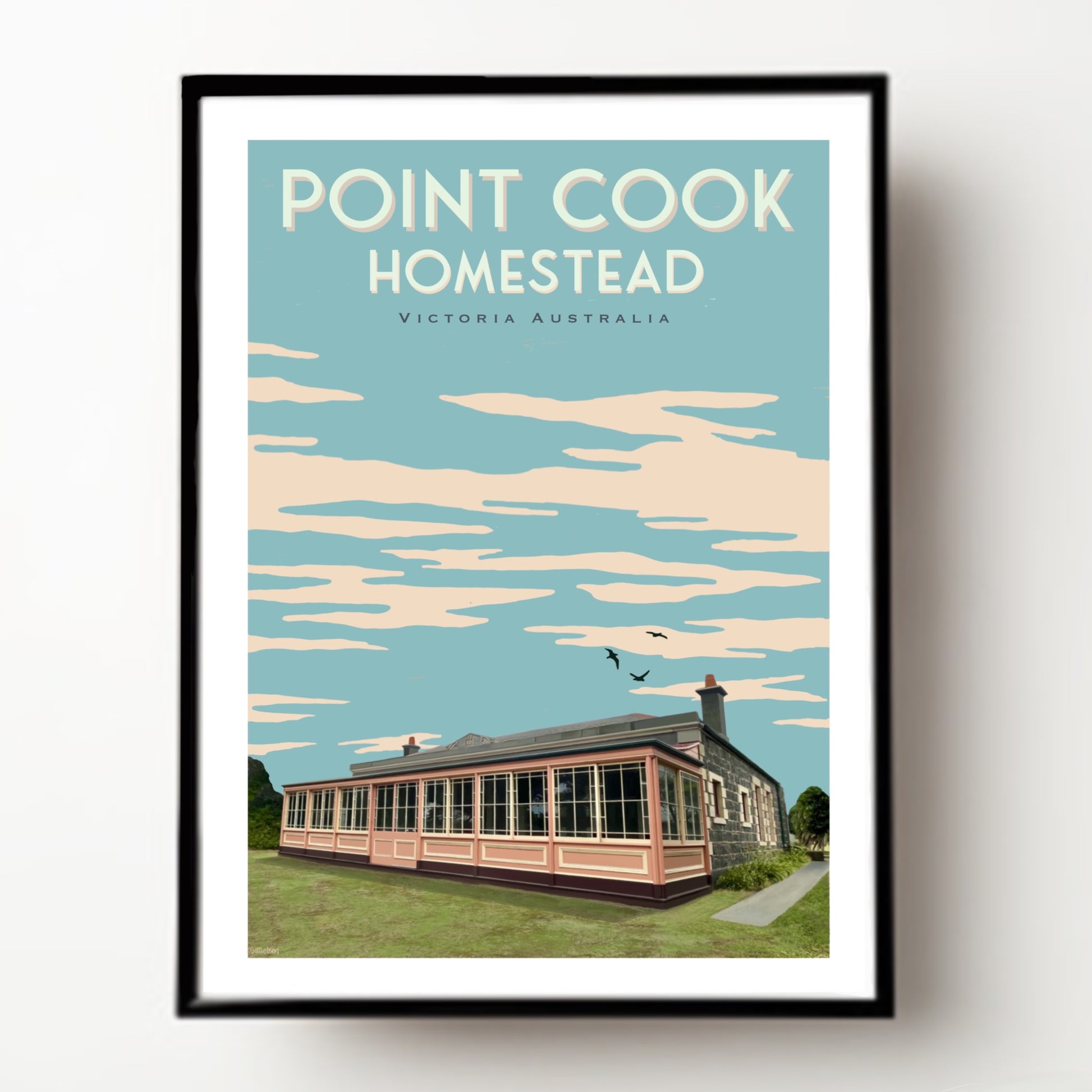 The Point Cook Homestead artwork is dedicated to the historic Point Cook landmark, renown for its striking pink front timber verandah and stunning bluestone buildings and stables, set on the Point Cook coastal park near the RAAF Base.