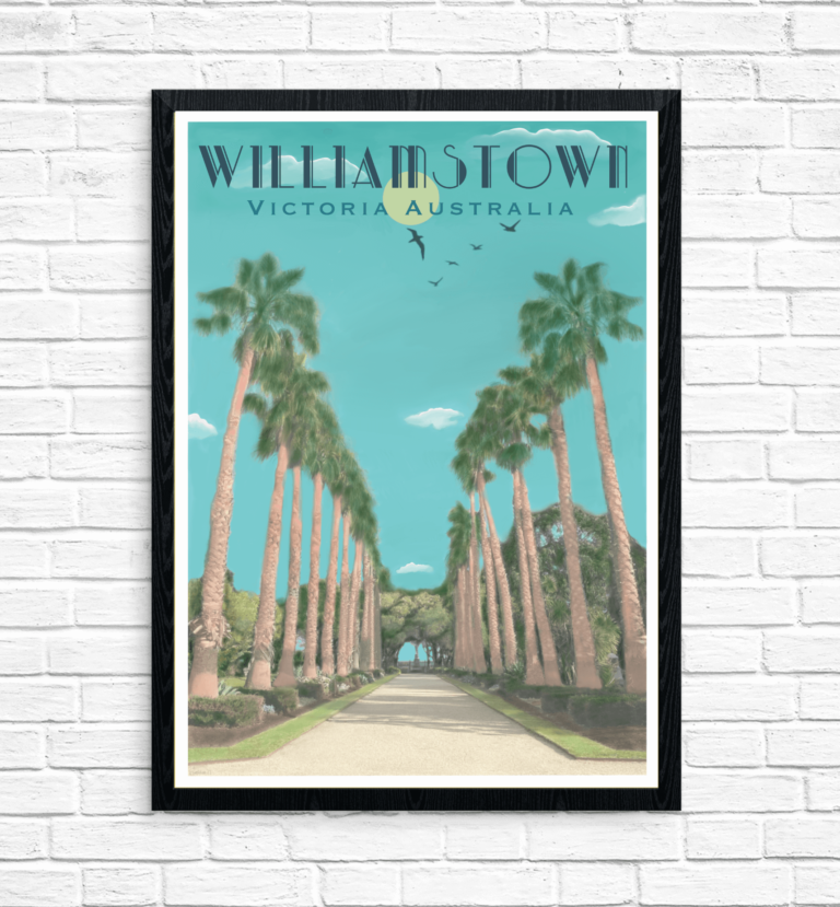 This vintage inspired wall art print captures the beautiful view down to the bay through palm avenue at the Williamstown Botanical Gardens.