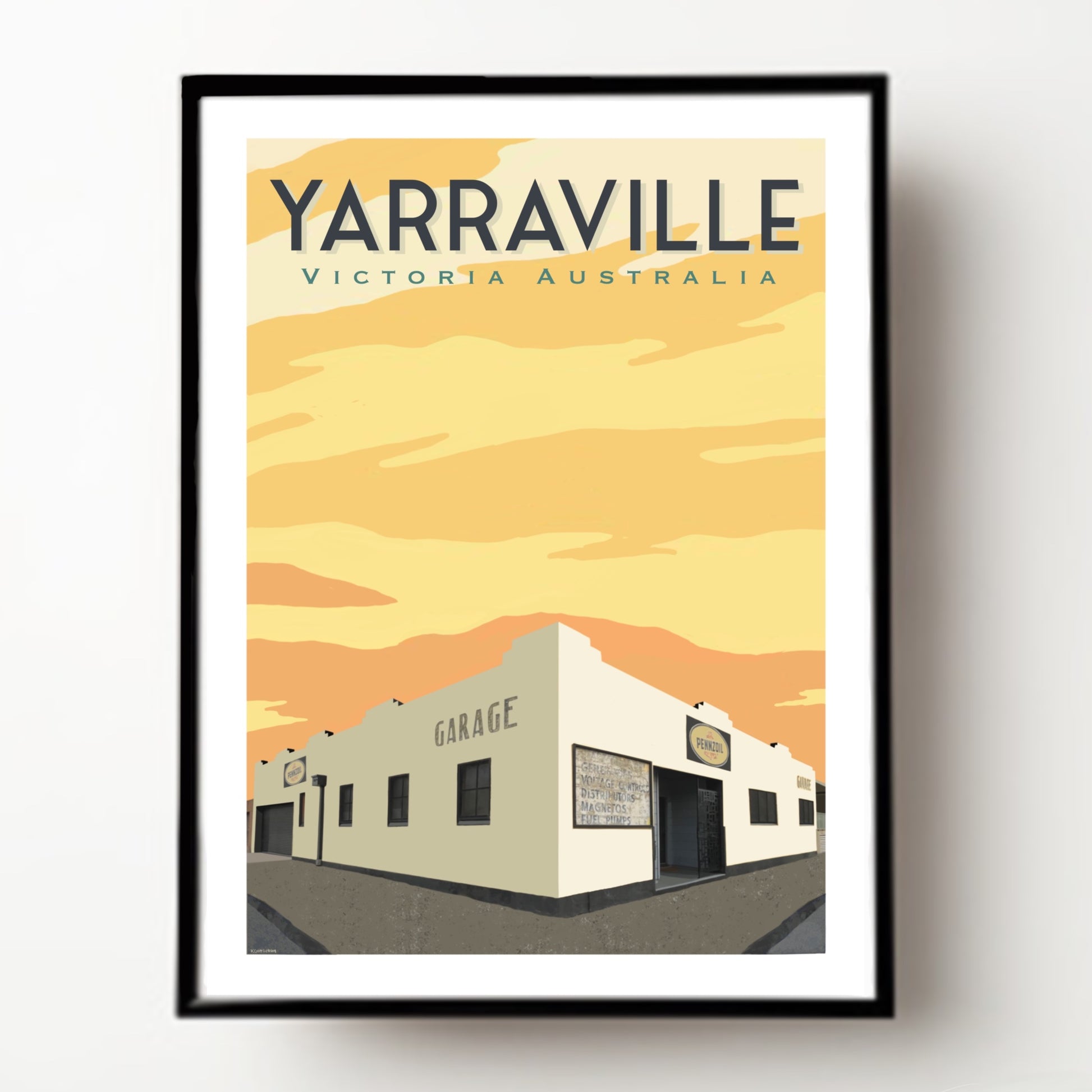 The Yarraville Pennzoil Sunrise artwork would make a great gift for lovers of Melbourne’s West, Ghost signs, Yarraville, and old garages.
