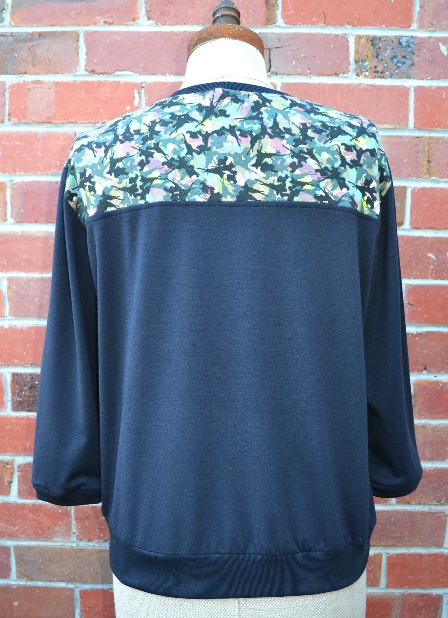 The sleeves are three quarter length, half way between the elbow and wrist. The lower back and sleeves are cut from a Cotton elastane t shirt jersey in black. Black cotton elastane rib bands on neck, sleeves and hip.