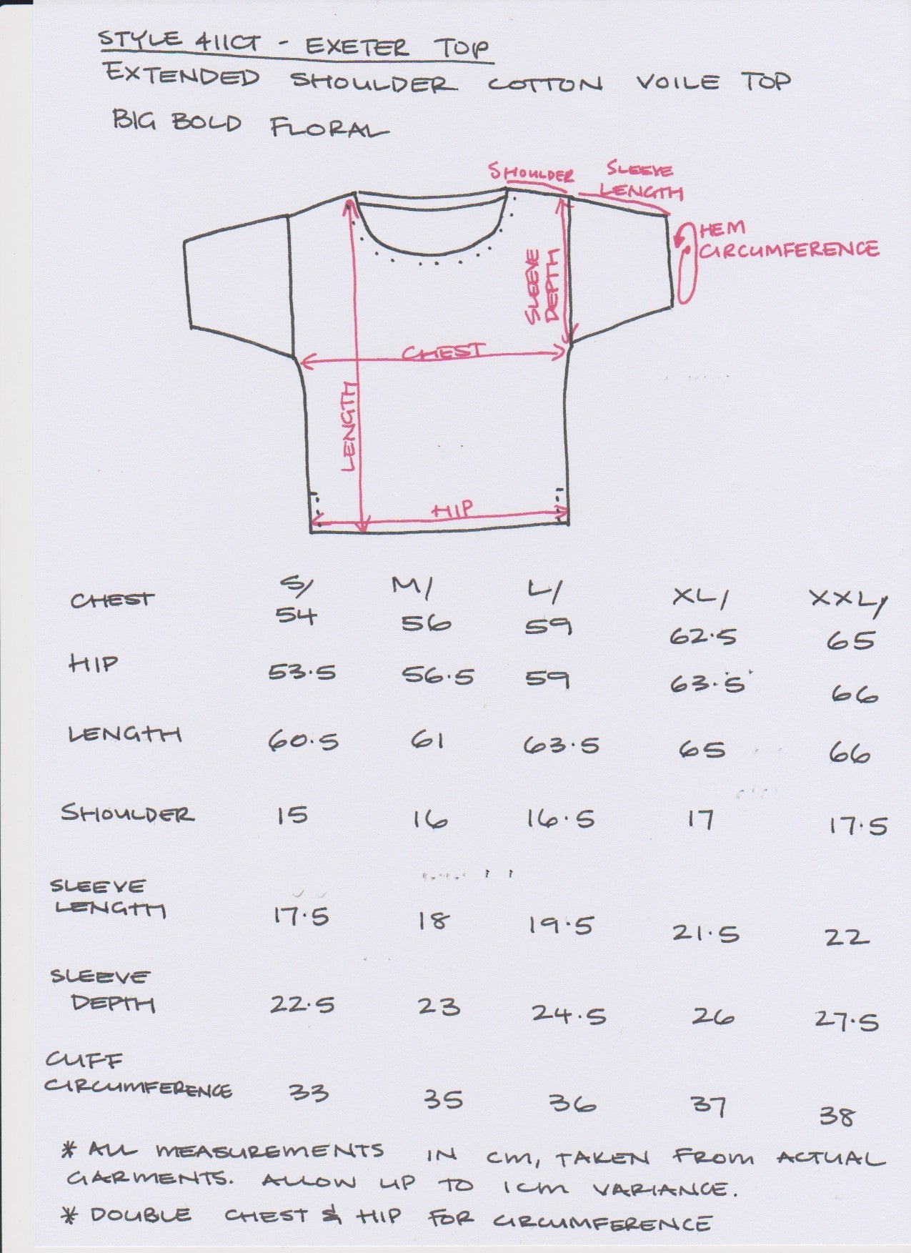 The 'Exeter' top is a relaxed T shaped top. This top is generous in fit across the chest. It has side splits and a short wedge shaped sleeve. The neck is bound with binding.