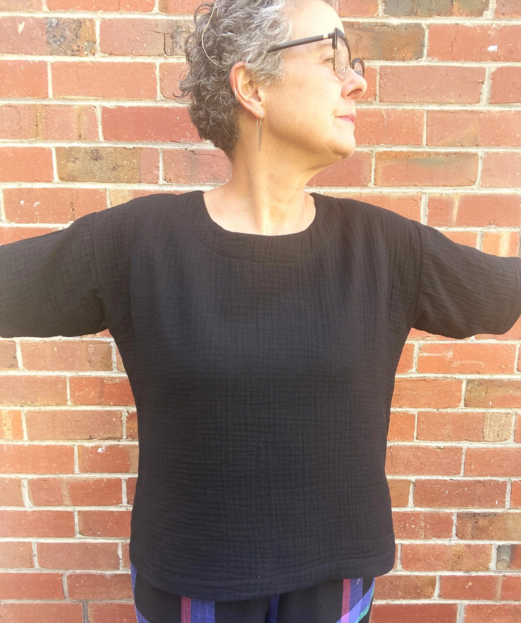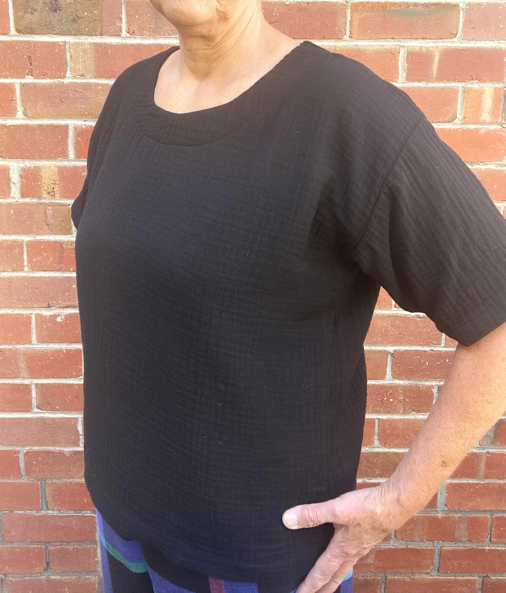 The 'Exeter' top is a relaxed T shaped top. It has an extended shoulder, wedge shaped short sleeve and is fairly straight through the body. The neck has a Black plain cotton facing which is fused to help keep its shape.