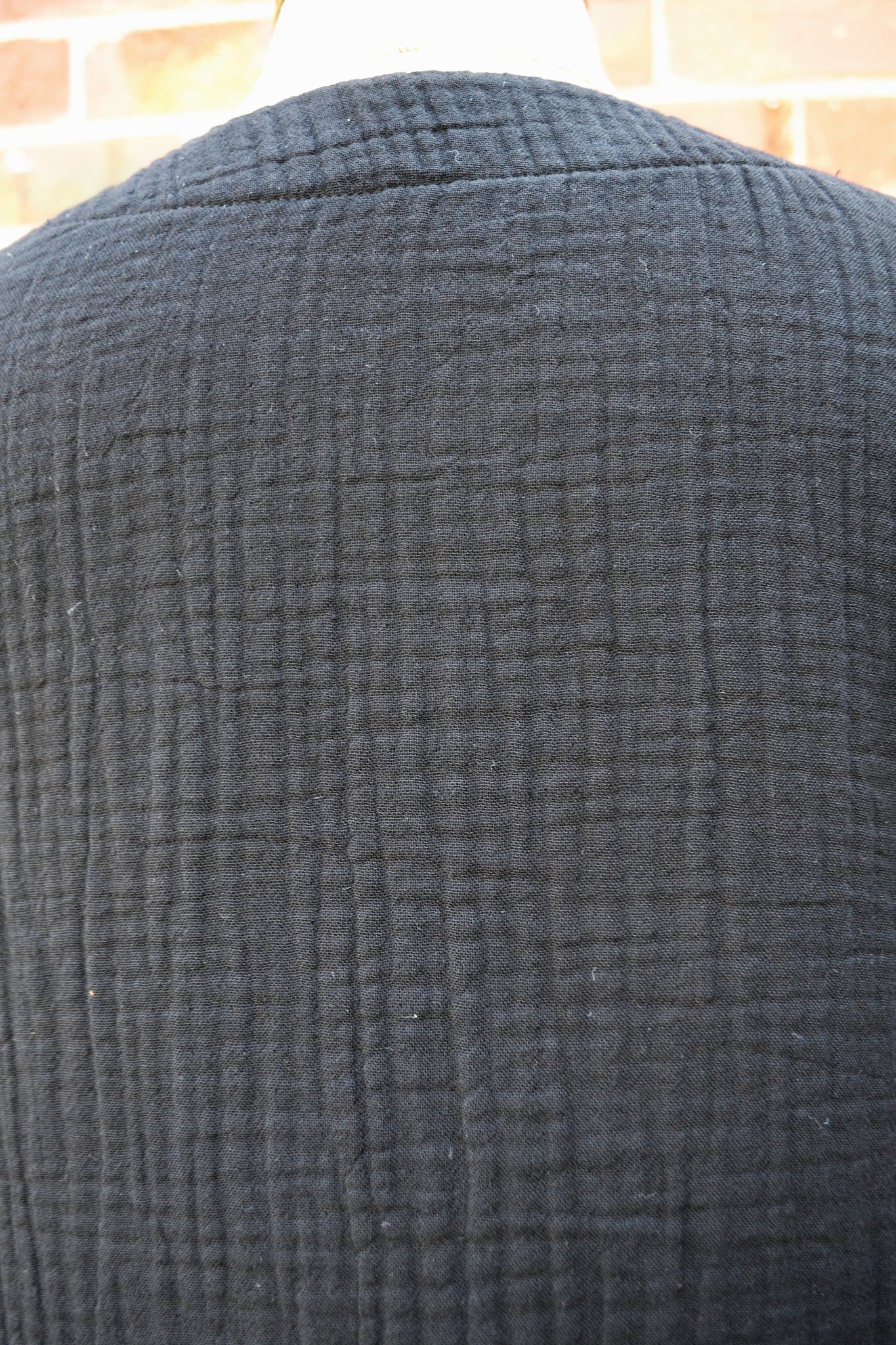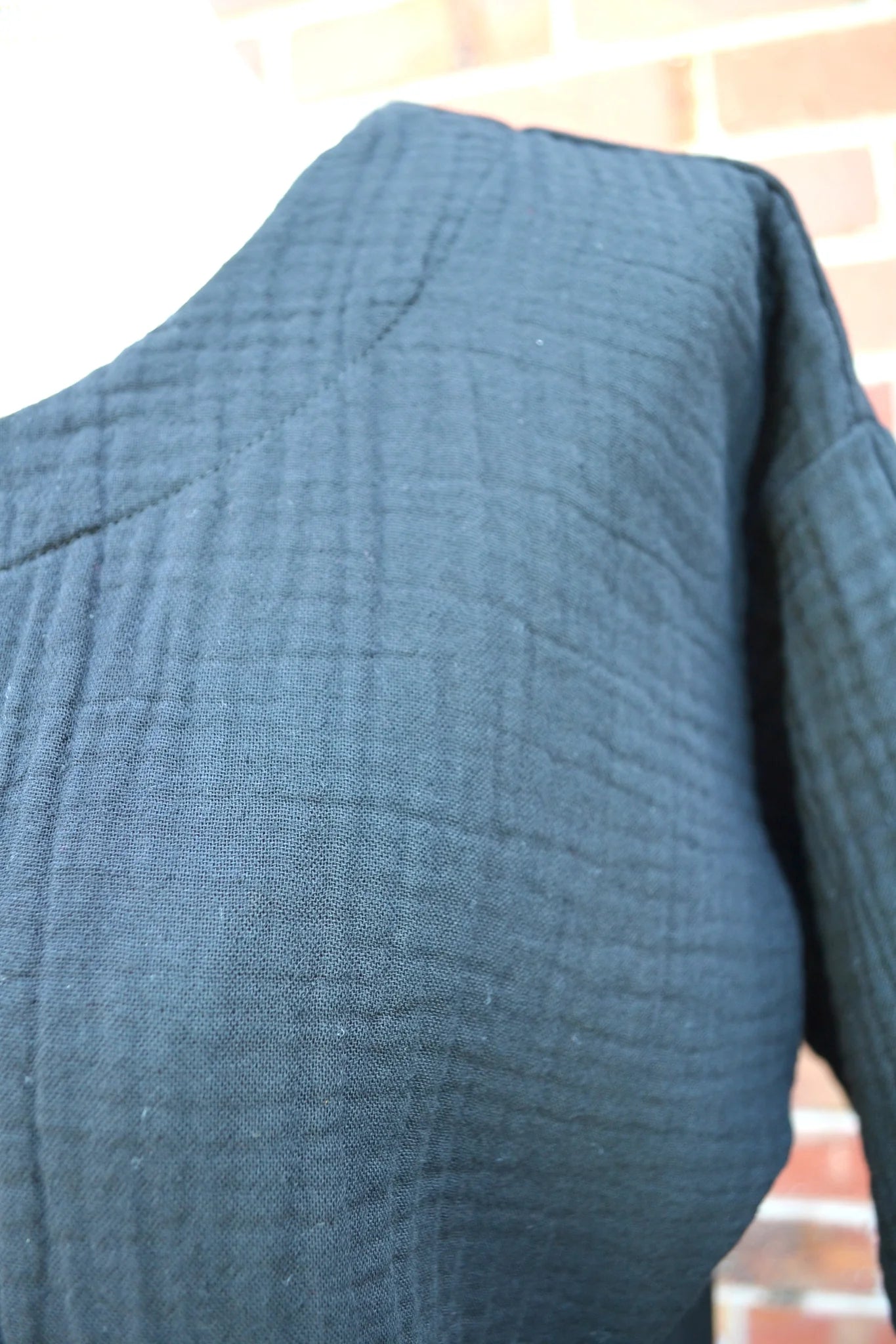 The fabric is called Double gauze. It is actually three layers of very light fabric stitched together which is how the texture is formed. It is very soft. The tops have been prewashed and measurements shown are taken after washing and pressing. No further shrinkage or relaxation is expected.