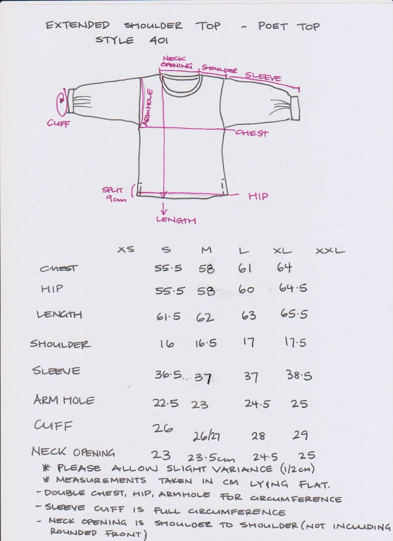 This is an easy fit shape with an extended shoulder, side splits and 3/4 sleeves. The Poet top sleeve has gathering into a cuff.