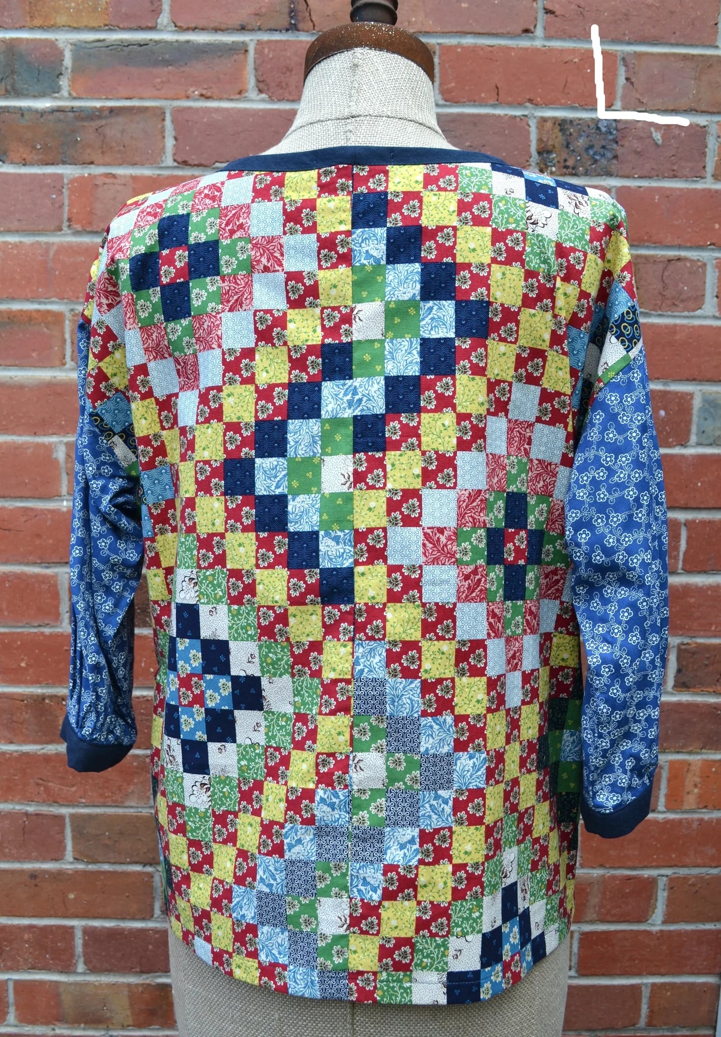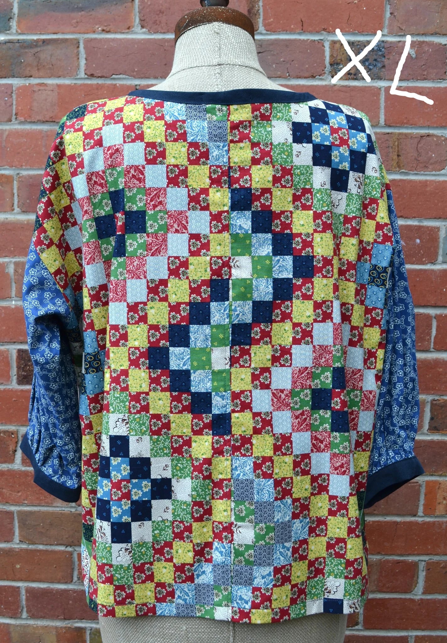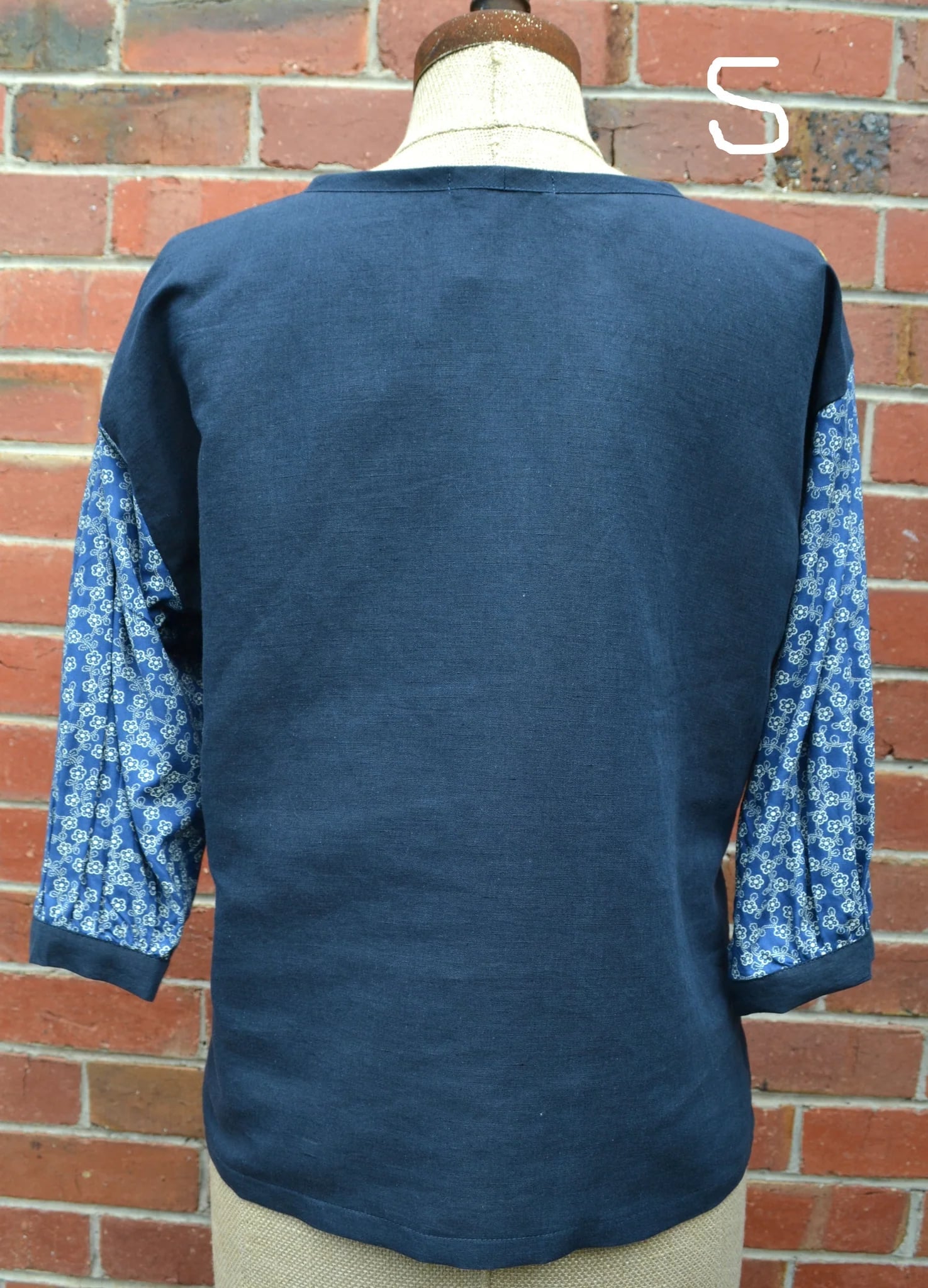 The sleeves are cut from a soft rayon that complements the print perfectly. We have used an inky navy for the backs on S & M, and used this fabric for the bindings and sleeve cuffs.