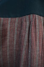 The lower back section is cut from a textured stripe linen fabric, which is gathered into the upper Black yoke. This tablecloth has been used and washed.